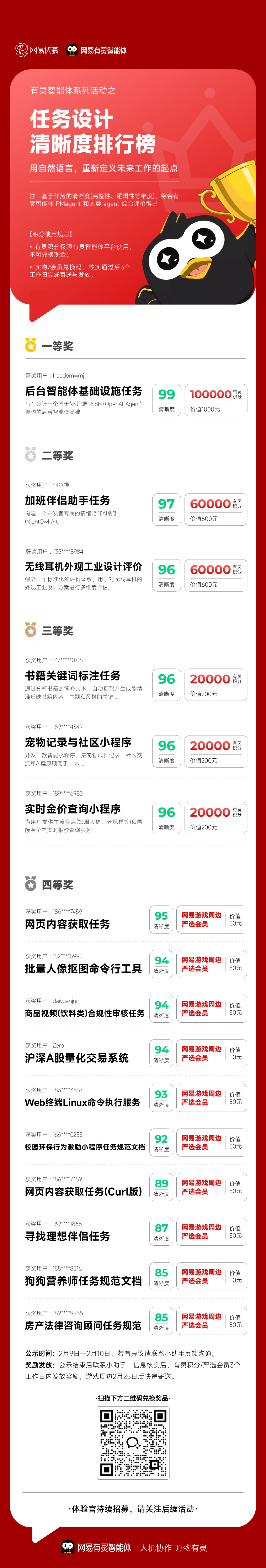 公示|网易有灵智能体「任务体验官」招募活动获奖名单出炉